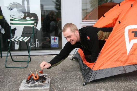 Hrólfur segir engu líkara en hann hafi verið að opna nýja raftækjaverslun með dúndurtilboðum, en engu mátti muna að hann hefði verið troðinn niður af trylltum hópnum þegar dyr Rebel opnuðu. „Mönnum þyrstir greinilega orðið í góða klippingu segir meistarinn“.